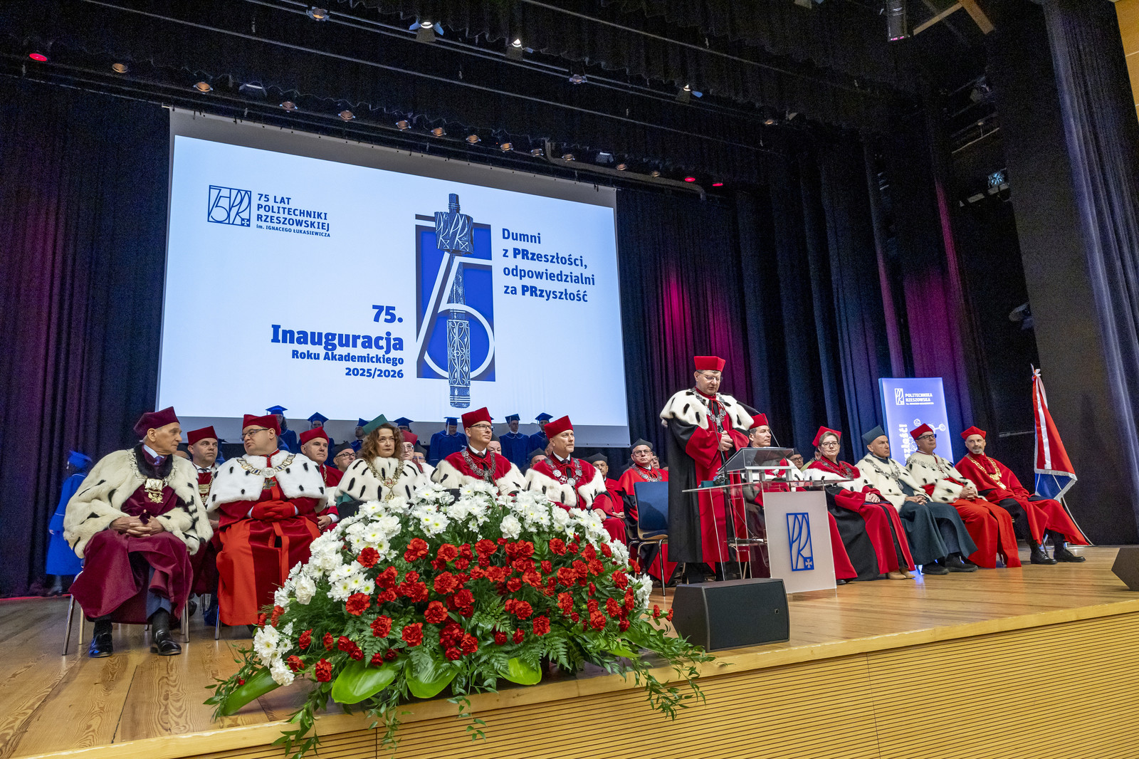 „Inauguracja roku akademickiego to nie tylko uroczystość, to także moment refleksji nad tym, czym jest uczelnia, kim jesteśmy jako jej członkowie i dokąd zmierzamy. W świecie pełnym niepewności uczelnia pozostaje jednym z ostatnich bastionów racjonalności, otwartości i dialogu. To nasza odpowiedzialność – chronić te wartości i przekazywać je kolejnym pokoleniom” – mówił rektor prof. Piotr Koszelnik podczas przemówienia inaugurującego jubileuszowy 75. rok akademicki na Politechnice Rzeszowskiej.