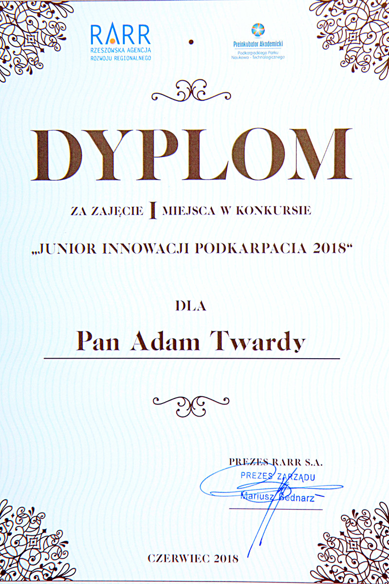 Tytuł Juniora Innowacji Podkarpacia 2018 za pomysł „Systemy wykrywania zanieczyszczeń na powierzchniach płaskich” otrzymał członek zespołu UVI Adam Twardy, student mechatroniki Wydziału Budowy Maszyn i Lotnictwa Politechniki Rzeszowskiej. Drugie miejsce w konkursie zajął Michał Szepke, student lotnictwa i kosmonautyki WBMiL, współtwórca projektu Airdurance. Trzecie miejsce otrzymał Mateusz Kot - student V roku architektury za „Aplikację komputerową do projektowania wnętrz przy wykorzystaniu technologii Virtual Reality".