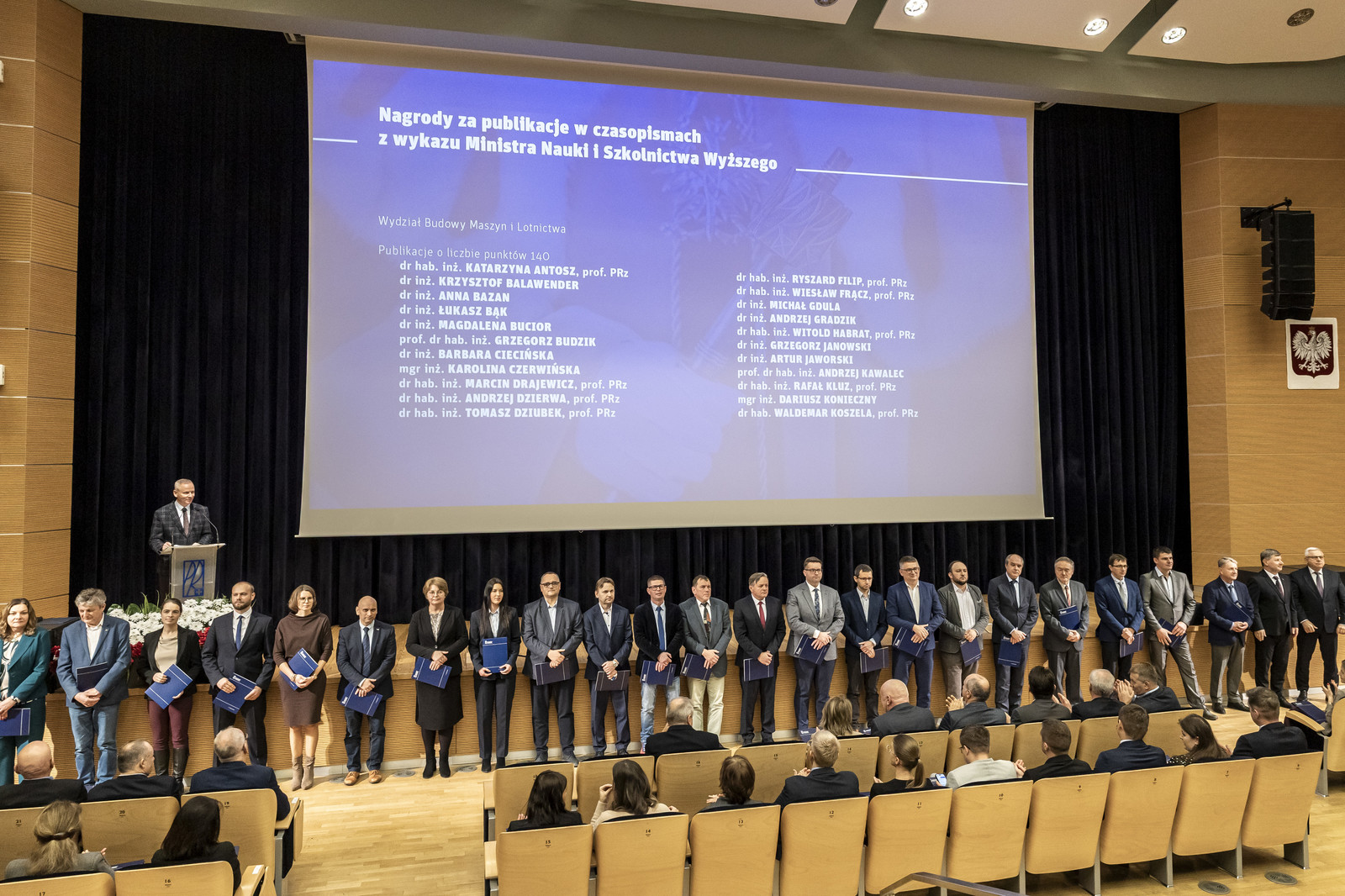 Nagrodami za publikacje o liczbie punktów 140 zostali wyróżnieni: dr hab. inż. Katarzyna Antosz, prof. PRz, dr inż. Krzysztof Balawender, dr inż. Anna Bazan, dr inż. Łukasz Bąk, dr inż. Magdalena Bucior, prof. dr hab. inż. Grzegorz Budzik, dr inż. Barbara Ciecińska, mgr inż. Karolina Czerwińska, dr hab. inż. Marcin Drajewicz, prof. PRz, dr hab. inż. Andrzej Dzierwa, prof. PRz, dr hab. inż. Tomasz Dziubek, prof. PRz, dr hab. inż. Ryszard Filip, prof. PRz, dr hab. inż. Wiesław Frącz, prof. PRz, dr inż. Michał Gdula, dr hab. inż. Wiesław Graboń, prof. PRz, dr inż. Andrzej Gradzik, dr hab. inż. Witold Habrat, prof. PRz, dr inż. Grzegorz Janowski, dr inż. Artur Jaworski, prof. dr hab. inż. Andrzej Kawalec, dr hab. inż. Rafał Kluz, prof. PRz, mgr inż. Dariusz Konieczny, dr hab. Waldemar Koszela, prof. PRz, dr inż. Barbara Kościelniak, dr inż. Artur Krzemiński, dr hab. inż. Andrzej Kubit, prof. PRz, dr hab. inż. Hubert Kuszewski, prof. PRz, dr hab. inż. Przemysław Kwolek, prof. PRz, dr inż. Krzysztof Lew, dr inż. Joanna Lisowicz, dr hab. inż. Paweł Litwin, prof. PRz, dr hab. inż. Janusz Lubas, prof. PRz, dr hab. inż. Maksymilian Mądziel, prof. PRz, dr hab. inż. Maciej Motyka, prof. PRz, dr hab. inż. Grażyna Mrówka-Nowotnik, prof. PRz, dr hab. inż. Jacek Mucha, prof. PRz, dr inż. Piotr Myśliwiec, dr hab. inż. Wojciech Nowak, prof. PRz, dr hab. inż. Andrzej Nowotnik, prof. PRz, dr inż. Robert Ostrowski, prof. dr hab. inż. Andrzej Pacana, prof. dr hab. inż. Paweł Pawlus, dr inż. Przemysław Podulka, dr inż. Łukasz Przeszłowski, dr inż. Grażyna Ryzińska, dr inż. Dominika Siwiec, dr hab. inż. Leszek Skoczylas, prof. PRz, prof. dr hab. inż. Dorota Stadnicka, dr inż. Karol Szostek, prof. dr hab. inż. Romana Ewa Śliwa, dr inż. Łukasz Święch, dr hab. inż. Sławomir Świrad, prof. PRz, prof. dr hab. inż. Tomasz Trzepieciński, dr inż. Paweł Turek, dr inż. Adam Ustrzycki, dr hab. inż. Lucjan Witek, prof. PRz, dr inż. Waldemar Witkowski, dr hab. inż. Paweł Woś, prof. PRz, dr inż. Sławomir Woś, dr inż. Marta Wójcik, dr inż. Małgorzata Zaborniak, dr inż. Waldemar Ziaja, dr inż. Marta Żyłka.