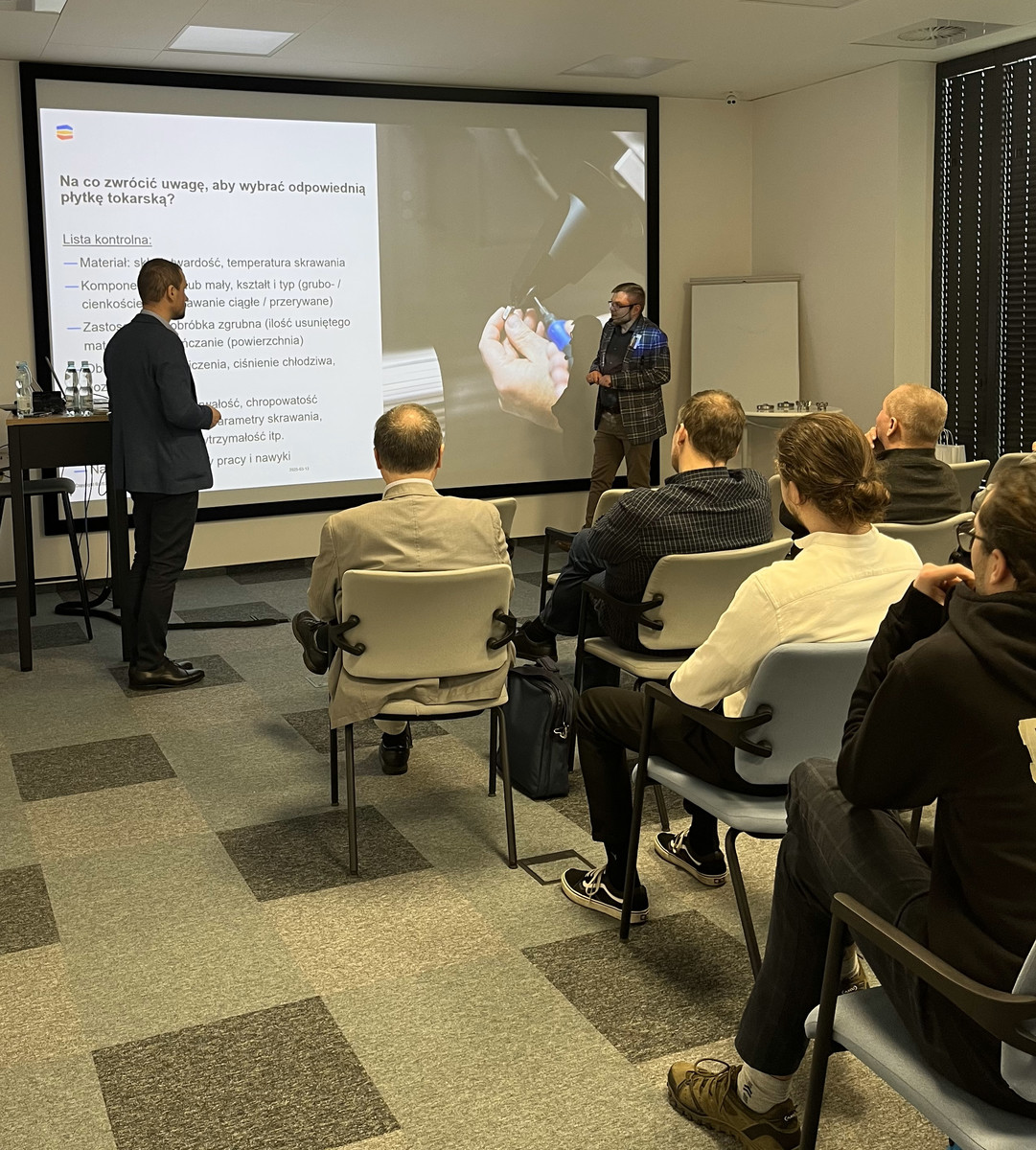 Seminarium było doskonałą okazją do zdobycia cennej wiedzy praktycznej i poznania nowoczesnych rozwiązań stosowanych w przemyśle. Szczególne zainteresowanie wydarzeniem wyraziła duża grupa studentów pierwszego roku studiów drugiego stopnia kierunku mechanika i budowa maszyn, co potwierdza, jak ważne jest dla przyszłych absolwentów łączenie wiedzy teoretycznej z praktyką. Uczestnicy mieli okazję nie tylko wysłuchać ekspertów, ale także na własne oczy przekonać się, jak różne strategie wpływają na formowanie wióra. Na zakończenie studenci otrzymali certyfikaty potwierdzające udział w szkoleniu, co dodatkowo podkreśla praktyczny charakter zdobytej wiedzy.