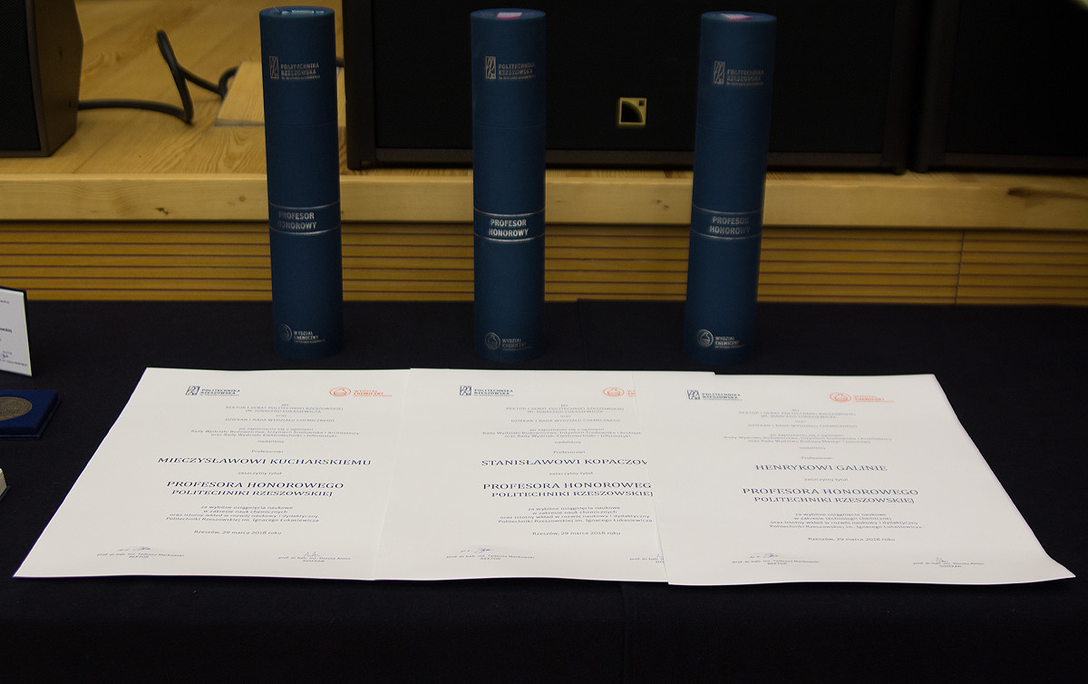 Podczas jubileuszu wręczono zaszczytne wyróżnienia: tytuł profesora honorowego Politechniki Rzeszowskiej oraz medal Zasłużonym dla Politechniki Rzeszowskiej. Tytuł profesora honorowego otrzymali zasłużeni dla wydziału i uczelni naukowcy: prof. dr hab. inż. Henryk Galina, prof. dr hab. inż. Zdzisławi S. Hippe, prof. dr hab. Stanisław Kopacz oraz dr hab. inż. Mieczysław Kucharski. Medal Zasłużonym dla Politechniki Rzeszowskiej otrzymał Tadeusz Pietrasz, prezes zarządu ICN Polfa Rzeszów S.A., absolwent Wydziału Chemicznego.